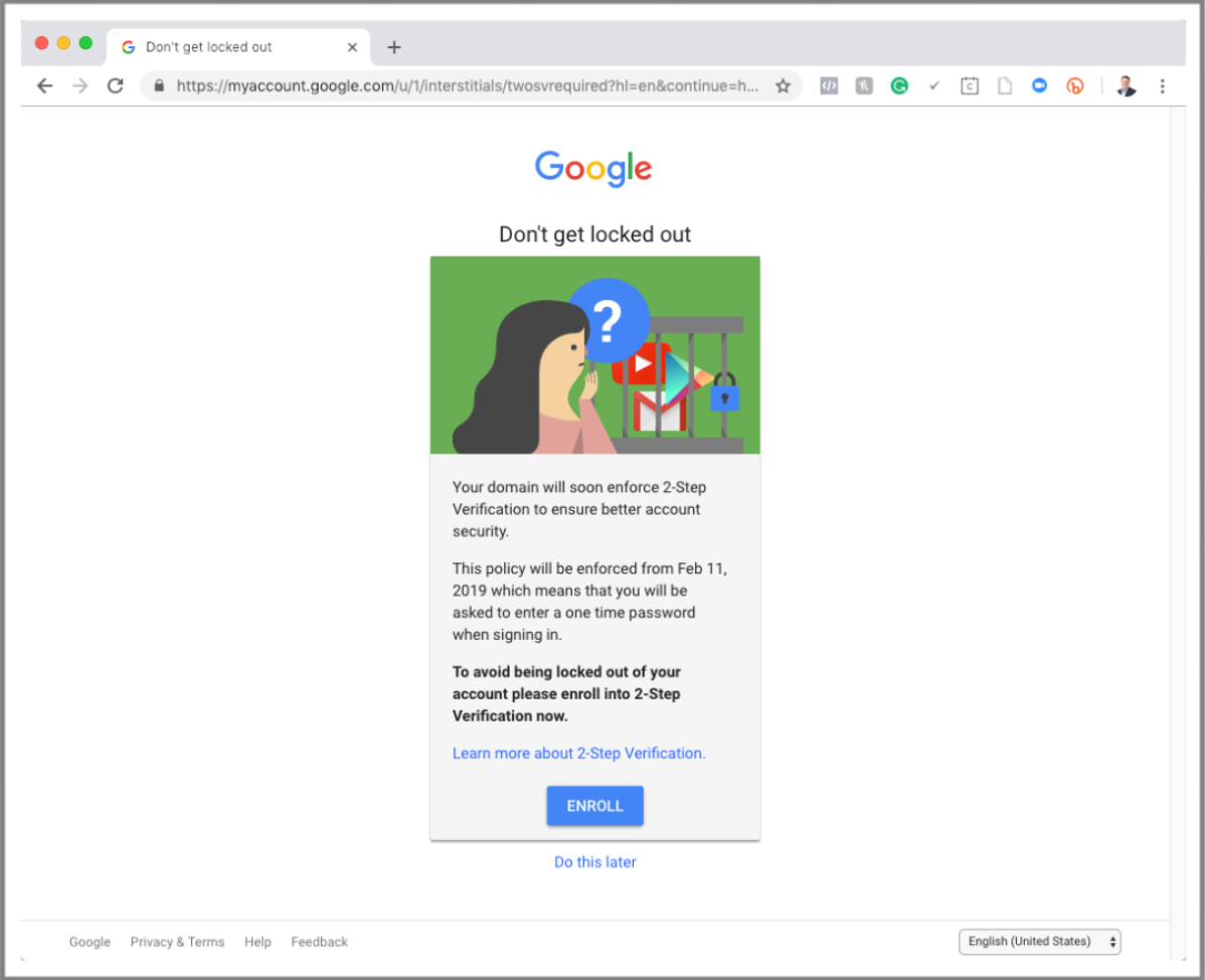 Click the blue “ENROLL” button to set up two-factor authentication. This will ensure that if someone tries to access your email from an unknown device, they will be prevented from gaining access to your email account.