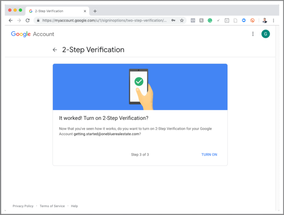 Click on “TURN ON” to complete the two-factor authentication enrollment. Once you’ve done that, your email is set up!