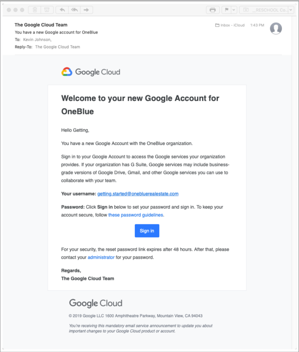 Check your personal email account you provided us when you joined for a welcome email that will give you a link to log into your CENTURY 21 Edge email account. Open the email and click the blue “Sign In” button as illustrated below: